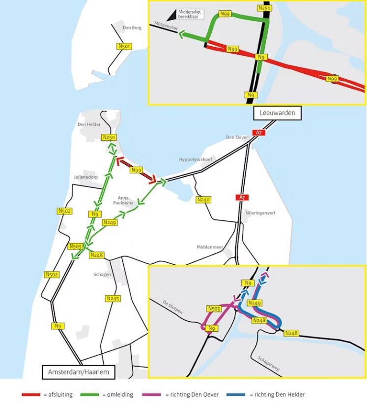 Van donderdag 7 november 20.00 uur tot maandag 8 december 06.00 uur is de N99 tussen de Van Ewijcksluisrotonde en de Kooybrug in beide richtingen afgesloten voor doorgaand verkeer. Verkeer wordt omgeleid via de N249, N248 en de N9 De verwachte extra reistijd is ongeveer 20 tot 25 minuten.